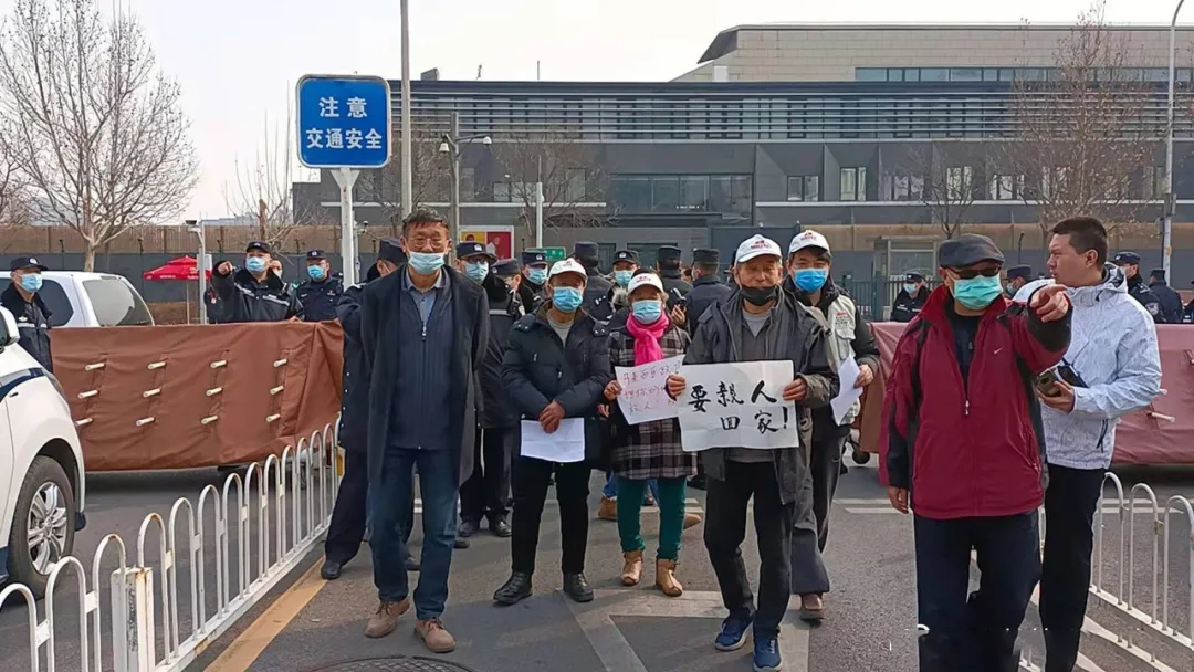 (图:2021年3月8日,栗二有和其他失联着家属,在马来西亚驻华大使馆们前)